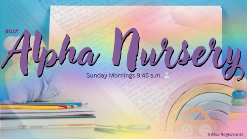 ALPHA NURSERY is open to the first 5 children ages 6 months to 3 years old to register each week. The first 5 registrants will be the only children allowed in the nursery class. Weekly, once registration hits the maximum number of children, registration will close but reopen again each Wednesday for the following Sunday. Parents, remember you must register each week for your baby/toddler to attend Alpha Nursery Sunday mornings. Drop off begins at 9:45 a.m. and must be done by 10:30 a.m. before the doors close and lock. Pick up is promptly after The Z Experience ends.