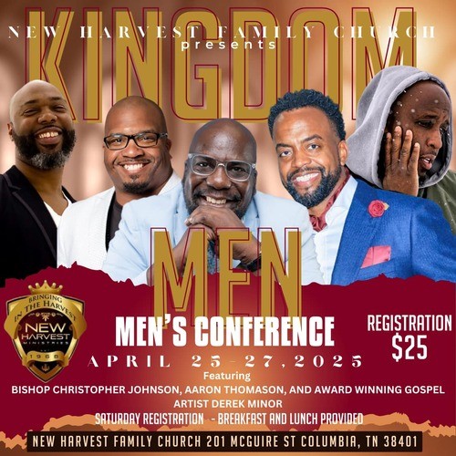 Join Pastor Derrick Wright and New Harvest Family Church April 25th-27th for their men’s conference, Kingdom Men: Claiming Our Destiny! On the roster are some phenomenal speakers! Friday night Pastor Steve Grey, Saturday is an all-day session starting at 9:00 a.m. with breakfast and lunch provided and special guest Derek Minor, and Sunday morning, Bishop Christopher A. Johnson, Sr. will bring forth the Word of God. REGISTRATION IS REQUIRED FOR SATURDAY! Three (3) children max (up to 17 years of age) are allowed with each adult registration. You don’t want to miss it! Sign up now! To register, click here!