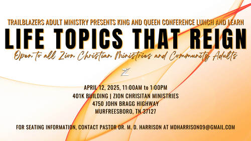 This Lunch and Learn Conference is presented by TrailBlazers Adult Ministry and is open to all ZCM and community adults. For questions or seating information, contact Pastor M. D. Harrison at mdharrison09@gmail.com. We ask that everyone register to ensure the proper amount of food may be prepared. You can Register TODAY by clicking here!